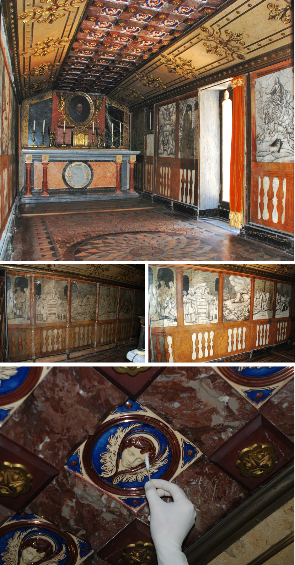 Piezas de azulejería (Siglo XIX) realizadas con un bajo relieve recubriendo todo el techo de la estancia. Los bajo relieves representan cabezas de querubines y están decorados con la técnica del reflejo metálico con retoques en azul cobalto.